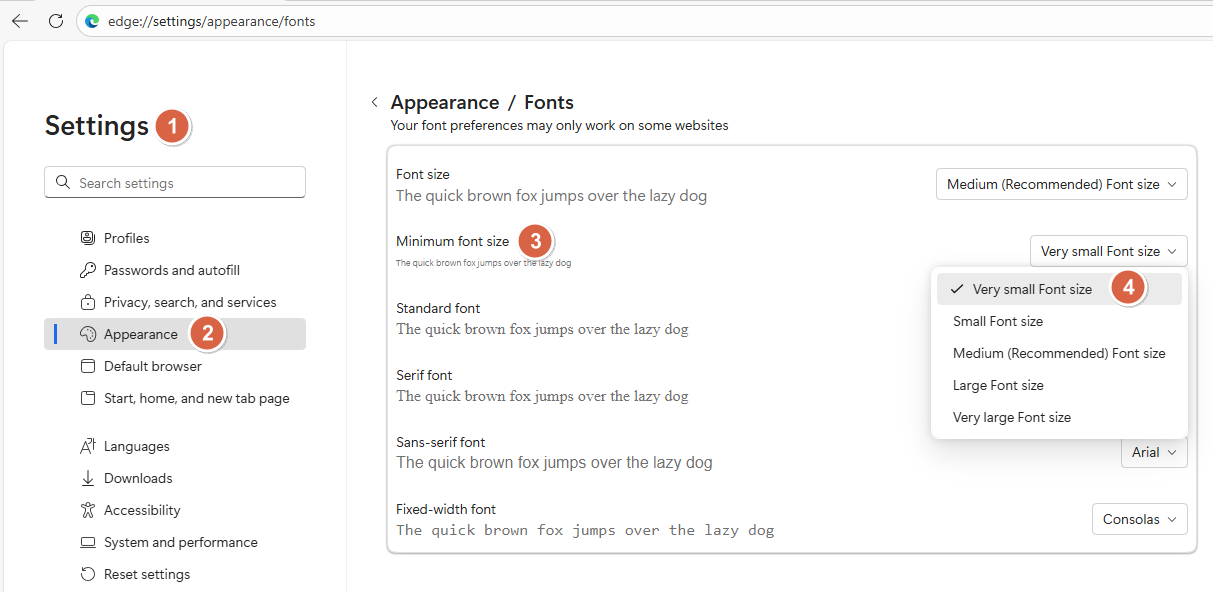 If you need larger text, use browser zoom instead of a minimum font size. Zoom scales the entire interface proportionally, helping maintain proper layout and alignment.